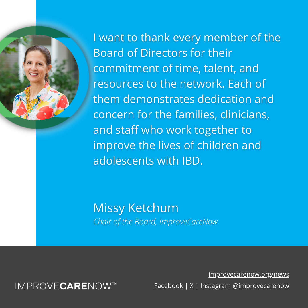 The Board will also review progress on the FY25-28 Strategic Plan and consider additional goals in partnership with ImproveCareNow's new Executive Director, Becky Johnson Rescola. Becky has been meeting with all of our stakeholders to listen and learn from them, and we are grateful for her leadership of the network.