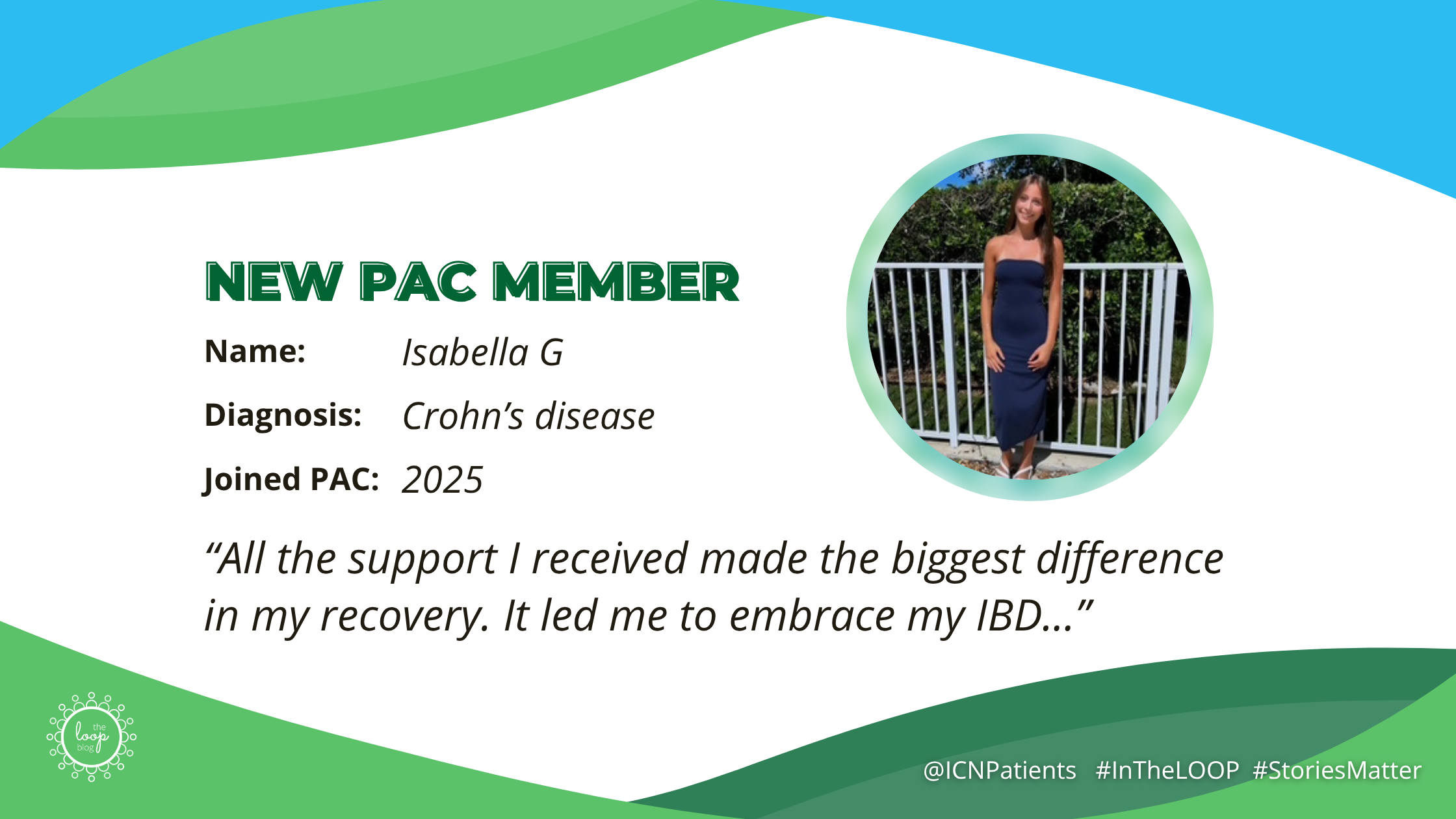 Hi! My name is Isabella, and I was diagnosed in October of 2023 with Crohn's disease. I began my treatment with Remicade infusions which helped bring my inflammation levels down. Unfortunately, I was still experiencing symptoms caused by a stricture in my ileocecal valve. This led me to visit a dietitian who recommended a dietary therapy called the Specific Carbohydrate Diet (SCD). With the SCD, I saw extreme symptom improvement and began to live a life free from the daily struggle of sickness and stomach aches. In June of 2024, I also underwent an ileocecal resection to remove all stricturing. Since then, I have been in total remission, and living a happy and healthy life, enjoying hobbies such as cooking, volunteering in my community, working at a local children's salon, and spending time with friends!