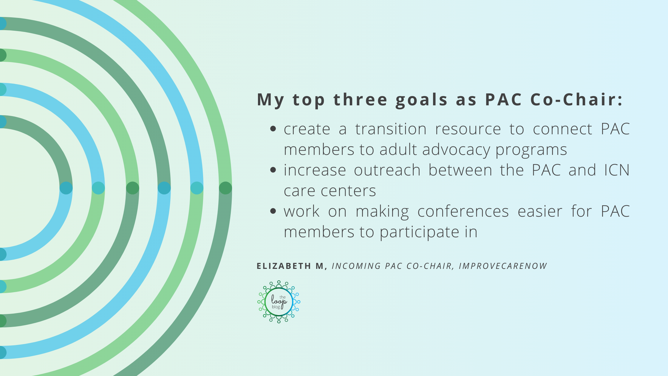 Hi everyone. My name is Elizabeth and I've been a member of the Patient Advisory Council (PAC) for about a year now. I'm excited that I will soon be serving the ICN community as PAC Co-Chair! Here's a bit about me and what I hope to work on during my time co-leading the PAC, and what I see as my main challenge.Â